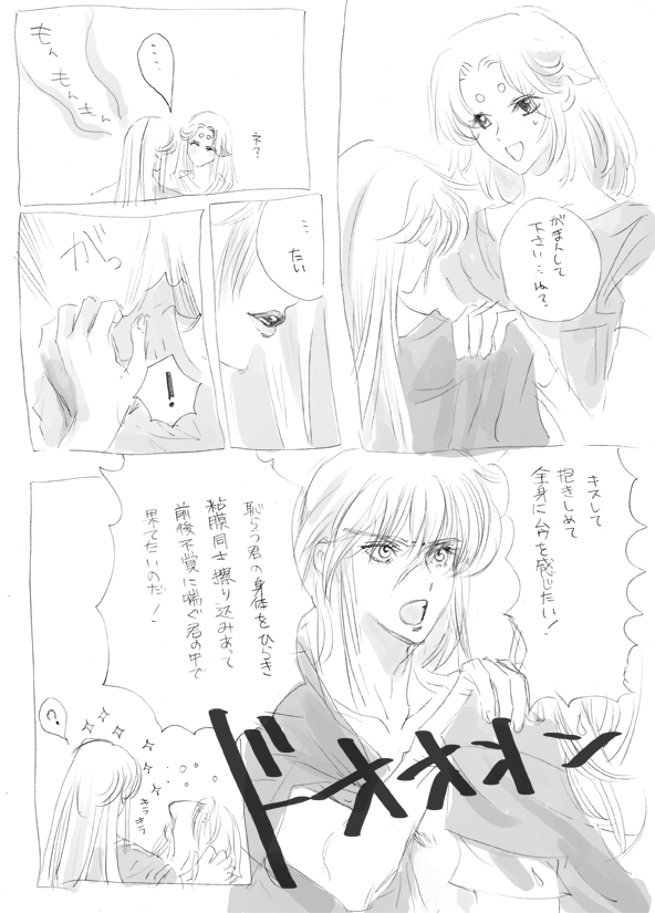 ええ、全部口走ってます全部。 えらい反則直球ストレートです。 バッターボックスにたったらボールどころか ピッチャーごと飛んできたよみたいなこの逃げ場のなさ。 のけぞるムウ様ののどもとにカプっといくのですね。カプっとー! どうしてそんなに輝いているのか緑色の髪の毛でもないのに 光合成してるんじゃないかとか後光後背の一種なのか。 キラキラして強引で細身なのに大仏の風格(違)素晴らしすぎます! ムウ様も抵抗できないというか勝てそうにもないのが良く分かりますvvv さてこの可愛くて反則で無敵でセクシーな瀬川シャカ。 うかがえばこの二枚目漫画はなんと拙宅仕様とか。 (これ拝読して、実際になんて言うかなあと思ってメモったのが瀬川さんに差し上げた 漫画モドキです。ですので気持ち甘味なのは仕方ないですよね。影響浮けまくりです。 そもそもにしてこのカッコよくも可愛い瀬川さんとこのシャカと会わなかったら うちはずっと微妙ながらもぎりぎりごまかしながらかろうじて「健全サイト」でした。 いまさらながらそんなめぐりあわせを思うと感慨深いです。…語りだしそうなのでこのあたりで。) 瀬川さん、大変に八ッピィなシャカムウをありがとうございました〜!(拝) 2008年10月16日 準備地点へ戻る トップへ戻る |