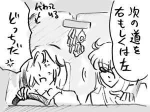 大人べったりな子供ムウ様。神経性胃痛で寝込むサガを看病して 寝ちゃうとかいうのはやっぱりいいと思います。 よこしまな小宇宙をありがとう…v 11月7日 ↓で絵について〜とかたいそうなこと描きながらやっぱり楽描漫画だと下書きする時間が惜しいです(駄目)。とんでもなくズレてますがお見逃しください。四コマとかノートの状態で公開できたらなあ。脳内映写機とか欲しい。イメージは画像で降ってくるので、絵か文か早いほうで出すしかないんですが、どっちも中途半端でモヤモヤします。自分の絵ってのもまだいまいちよくわからないけど、自分の文ってのはさらに怪しい。いろいろ修辞が変ですがもう、あれです、勢いってことで。『楕円幻想』は、花田清輝とは何の関係もありません。10日追記。 |