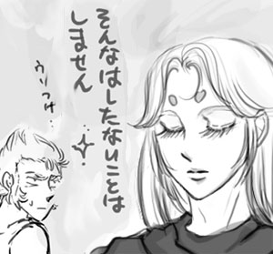| シャカが運転席に座っていたらそのまま上りの電車に乗って帰る ・・・いや、なんとなく・・・ たとえば都心に住んでるムウ様が郊外のシャカのうちに仏像の修理にくるので 最寄駅まで車でお出迎えしようとするシャカに対して。 シャカの車の中は仏像だらけで、お守りもきっとみっしり。お香にまじってほのかにカレーの香り。 「むっ・・・なんでこんなところにめがねのつるが!?」 「そこにめがねがあるかだらだよ」 とかいって目を閉じているのにめがねをかけるシャカ。 BGMは般若心経とトランス。空も飛べるはず。このさいいつもの象でもいいや。 ええとネタがぐるんぐるんしてて苦しいです。 四コマのほうが楽しいのは取っておきたいですが、ペンタブ持たせたら今は危ない人です。 私がキテレツなシャカが好きなのでこんなんですが ・・・シャカはでもハーデス編ではまともですよね(当人比) 人様のシャカは素直にかっこいいと思えるのになあ・・・ 10月3日 |