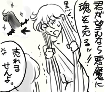 混ざってすみません。 先日のシャカの運転ネタより。 自宅から駅の道のりで迷っていたら常人であれば何かおしまいですが シャカなら家に帰るうちに日が暮れてしまっても驚きませんね。 六道めぐっていてもおかしくない。 その場合年越しそうだなあ…。 わたしも教習所でよく怒られました。 信号無視してしまって試験に落ちました。逆送もしました。 田んぼにも落ちました。 出来る限り運転はしたくないです。 休止してからずっと落書きしたくなるから(羊禁断症状) 裏が白い紙は極力持ち歩かないようにしてるんですが、 先日は気が付いたらとうとうレシートの裏に書いてました。 そのため一コマずつ。もう飢え過ぎにもほどがある。 さてたったいま某さんとこでサガムウぽいという曲に遭遇しました。 その名も『ノーザン聖衣』という(伏字になってしまった笑)ある有名なアニメの 主題歌のうちの一つらしいのですが、早速歌詞を検索したら めちゃくちゃ直球サガムウでひっくりかえりました。十二宮の前あたりとか! まだわたしの脳と心臓と魂と中の人に悪いので曲や番組は未見です。 しかし書き写した歌詞を読み直すと、萌える一方でこう… サガムウがとっっても夢見がちなカプ ってことを再認識せざるをえません。 もう好きなものはもう仕方がない!ですね。 10月6日 |
