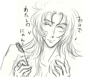愛を試す バトンでいただいたのではないと思いますが。勝手に。 ★愛の試練バトン★ (趣旨:[ ]内に指定されたキャラを当てはめ、それでも愛せるか!!を問います) ムウ様やシャカはもうどんな予想外なものが来ても動じないと思うので カッコよいのが一番の美点のサガにやってもらいました。 指定→サガ ●箸が上手く使えないサガ しごく上品にナイフとフォークを要求すると思うので問題なし。 でも蕎麦とかフォークで食べられたらどうしよう。 ●蝶結びがどんなに頑張っても縦結びになるサガ 地味に頑張るサガかわいすぎる! 黒だったらブチっとなそれで全裸はお約束というか。 巧く結べないんだ、って照れくさそうにムウ様に言って結んでもらうといいですよ。 ●スキップができないサガ それも考えにくいですがもしそうならとりあえず動きににくい法衣のせいにして、 風呂場でひそかに猛練習。もちろん全裸で。揺れますね。 ●横断歩道の白い部分だけ踏んで渡るサガ うっわーいかにもこっそりやってそう笑 ●人見知りのサガ 仮面被ってしまうってことですか。 外面はよさそうにしておいて絶対に心は開かなさそう。 ●炭酸でむせるサガ これは萌える!愛らしい。 目が真っ赤になってしまうのもいい。 そのあと何事もなかったかのように取り繕うさまがみたいです。 ●毎日自動改札機に引っ掛かるサガ 髪の毛。きっと髪の毛の静電気のせいですよ。 ●口癖が「ぶっちゃけ」のサガ きっと13年間の秘密が重すぎたんだ、と思います。 ずっと「ああぶちまけたい」と思いつづけて来すぎたのでしょう。 けしてサガには似合う言葉ではないと思いますが、 そう思って血の涙を流して耐えます。 ●猫を『にゃんこ』犬を『わんこ』と呼ぶサガなんだか子ども扱い来た〜〜〜!! いや、それを黄金チビっこたちに言ってたら萌えます。 うわきゃーそんなサガファンがバタバタ倒れるような真似・・・ ●回転ドアに入るタイミングが掴めないサガ 普通にそのうち回転止めて入りそうです。 あるいはそんなわけのわからないドアからは出入りせず 非常口とか使って出そう。うわつまらない大人! 右の落書きはにゃんこ・・・の悶えの産物です。 上のムウ様耳とかあったんですけどかろうじてここではこらえました。 ●何を思ったか自主制作に入るサガ 自主規制に見えたわたしはもう寝ます。 28日 |