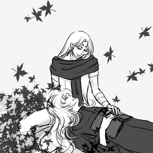 紅の上に横たわり、柔らかそうなムウ様のフトモモ枕でもうひと寝入りするシオンと あまりに無防備な姿に困惑しながらも、いつもは怖い師が今は少しだけ近いような気がして、 落葉にまぎれそっとその手に触れてみるムウ様。 一面に敷かれた紅が血のように見えて少し心がきゅっとなったことはシオンには内緒です。 サガムウとシオンムウは一番混ぜたらいけないと思うんですが、 なぜか並行してとっても萌えられるカプなんです。 頭おかしいのはもとからです。 でもムウ様がシオンも凄く好きでサガも愛してしまったら …またそれはおいしいと思うんです。 そもそも葉っぱが違うとかはお見逃しを。ふ・・・雰囲気で。2008.11.21. |