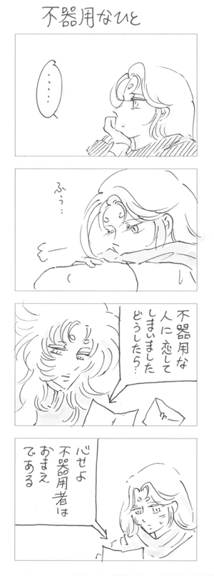 「陥落」って素敵な言葉です。誇り高くて意志が強いムウ様だからこそ 追いつめて、崩して、そのうえであんあん言わせたいのです。 そういう意味では相手は誰でもいいです。 すでに堕ちて我を忘れるほど快楽に酔い狂うのもいいですが、 その手前の落ちる落ちないのせめぎ合いも好きです。 たしかに相手は誰でも美味しくなる可能性はあるのですが、 心理的精神的かつ肉体的に追い詰めてギリギリまで翻弄してくれそうな 相手がいいなあ。 と、常々妄想してます。 151102 次の四コマ(多分10日後くらいに描きます)健全なんですけど、戻れるのだろうかこれで…。 |