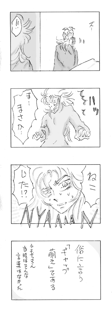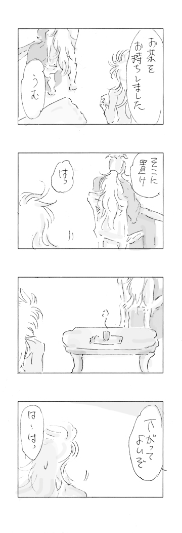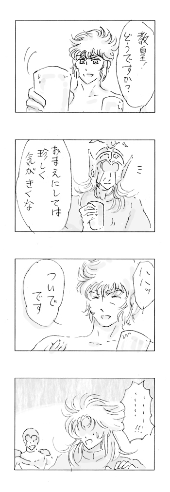 大変長らくお待たせしました。"3dot"の瀬川ハイジ様よりいただきましたキリ番リクエスト233150(兄さん最高!)のお題『サガ→シオン』です。 それに加えてのサガムウには…今回は謎の健全スイッチが入り行けませんでしたが、 「エロはなくても憧憬みたいな思いがサガにあればなおよし」というお言葉のもと、 サガのシオンコンプレックス炸裂の回って感じです。 サガとシオンはもともとはそんなに仲が悪くなかったと思われます。少なくともスターヒルでの、苦しむサガを気遣う様子(「気分でも悪いのか」発言等)から、シオンは「普通に」接していたと模様(当人比)。 その当時の(も)、サガはおそらく自意識過剰気味というか、超神経質というか、真面目なあまりに比較的損な役回りというか、そういうのがあったのかなあと。 結果として悪が発生するわけですが、それも次期教皇を意識したときから、おかしくなったのではないかと個人的には思います。 圧倒的な実力の差があるシオンを前に、弟の存在や悪の自分をひた隠しにしながら、「神のように」清くある…心労の尽きない少年時代だったのでしょう。 ちなみにアイオロスの筆跡は人馬宮に見られるので、別に悪筆だったとは思いませんので完璧に捏造です。うちのアイオロスは軽いですが、原作のイメージでは実直な文字を書きそうです。 サガはもうめちゃくちゃ綺麗な繊細な、しかし男らしさのにじむ文字だろうなあと。 シオンはもはや独自の略語や文字など作り出しそうです。 最後のオチ?に関しては、シオンは常々、猫っぽい(マヌルネコとか)と思っていたので猫舌という捏造なんですが ジャミールは半端ない高所だから沸点が低いとか高くないとか?もある…のかしらどうなのか…。 タイトルは、サガはいろいろ心の中にしまいこみすぎ、ということで、つけました。 もともとはZarifのBox Of Secretsから。 最近のお気に入りです。分かりやすくノれます。 youtube.com/watch?v=NYhIgT8YIrk(Official Video) 瀬川様には、キリ番リクエストの際(スクショもいただきました)、サイトマスターさんからのリクエストだと企画が内輪っぽくなるかもと 他の方から申し出があればそちらを優先に、というお気遣いまでいただいてしまいました。 この場をお借りして重ねてお礼申し上げます。ありがとうございます!! ええと、そんなわけで、大変お待たせしたわりに、ヨレヨレですみませんが、 久しぶりにものすごく楽しく描けました! 瀬川様、本当にどうもありがとうございました…! 20160904油すま吉(最高な兄さんたちに幸ありますよう…!) topへ戻る |