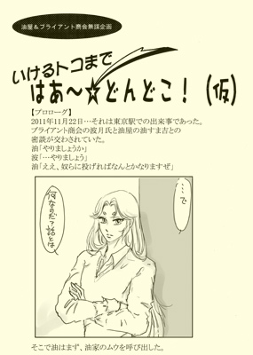 『いけるトコまで はあ〜☆どんどこ!』(仮) シャカ+ムウ 【シャカムウ気味注意!】 R18になだれこみたい油とそれを阻む波月とが 丸投げし合うギャグ漫画応酬。 お互いキャラまかせで行き先不明見切り発車したまま、 現在さらに混迷を極めている。 12ページ、A5、無料配布 ☆通販ご希望の方は油までメールでご一報ください。(22日追記) 波月さんをして 「過去に私の描いた中では最も得体の知れないシャカかもしれない…。」 と言わしめた(笑)ギャグ本です。 ちなみにわたしは隙あらば寝技(=R18)に持ち込もうとしてるので、 そういうギャグを波月漫画に求めていない方はご注意です。 っていうか波さんファンの人にとりあえず血祭りかも。 よろしくお願いします〜!(文責:油) |
