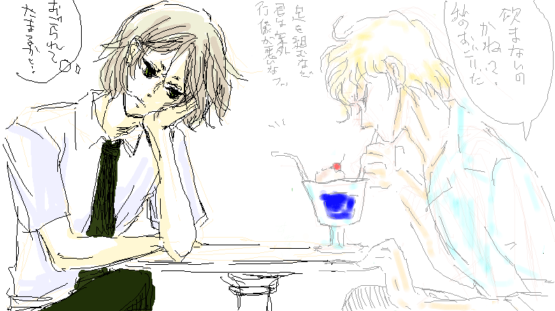 :::::::::::::::::::::::::::::::::::::::::::::::::::::::::::: 「飲まないのかね。わたしのおごりだ」 そう偉そうに言うシャカは ものすごい色の飲み物を飲んでいる 「要らない。」 添加物とか青色何号とか そういう毒にあたって 死んでしまえばいいのに。 「おごりだと言っている」 要らない、というのはさっき言った。 ・・おごられてたまるか。 もう無視。 絶対に無視。 この、僕のお気に入りの喫茶店 そっちが勝手に入ってきたのに 僕が帰る筋合いはないし。 怒るのも大人気ないから しばらくここにいてやるけど 君なんか完全無視だからね。 「足を組むなど君は案外行儀が悪いな」 …君にいわれたくない。 「肘をつくのもマナー違反だ」 放っておいて…って。だいたい誰のせいだ。 「上のチェリー要るかね?」 「要らないったら!」 ・・・あっ 答えてしまった。 僕のバカ・・・。 :::::::::::::::::::::::::::::::::::::::::::::::::::::::::::: |