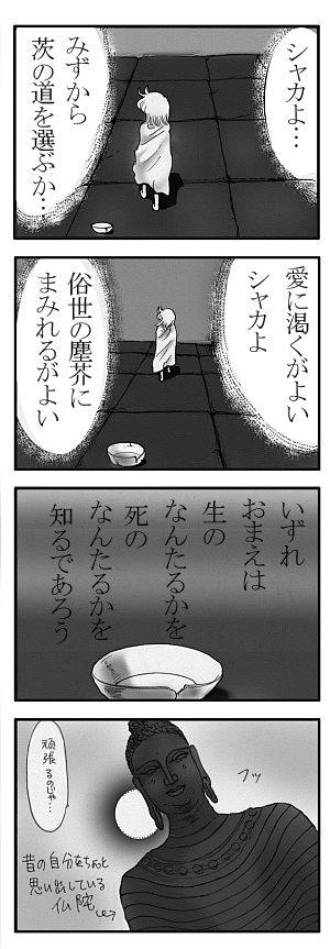 シャカは宗教者としての孤独で静かな生活を眼前にし、何もかも捨てて、修羅の世界に行く…