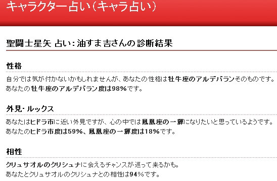 そんなに激しくアルデバランだったのですねわたし・・・ いや一輝は好きだけど何故市とクリシュナ。 モヒカン…モヒカンなの? そういや昔、半径30cmくらいハードモヒカンの子と仲良くしてましたが…運命だったのか(笑) …仕事に戻りますったら戻ります。 出典 聖闘士星矢成分分析占い↓ http://bluesnap.jp/charaseibun/uranai.php?uranai=Um6hplx 同、キャラクター占い↓ http://bluesnap.jp/character/uranai.php?uranai=Um6hplx 星矢はキャラが濃いから普通の漫画より衝撃度が高い…(笑)07.06.28 |