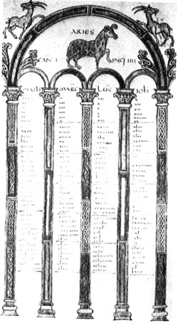 羊の話,もう一年も放置していたことに愕然。 油壺、ひさびさすぎる更新です。 さて、「カノン」画像のご紹介です。 あのポセイドンをたぶらかしたやんちゃすぎる双子の彼では ありません。「正規の、規律」という意味のCanonで、パッフェルベルとか のカノンに近いです。聖書の目次のを一覧表にしたのをカノン・テーブルと呼ぶわけです。 で、そんなカノン・テーブルの中に、アリエスを見つけましたよ〜〜! おおう貴重〜〜!と一人で盛り上がっていたのでした。 (写本の装飾に黄道十二宮を扱うのはかなりあるんですが、つい興奮!) ちょっと冷静になって見てみると、羊の目が高橋留美子女史が描くような ちょっと嫌らしい目つき(笑)だったりすることに軽くショックを受けつつ。 12のカノンの第一を飾るアリエスでございます。(↓右が拡大)