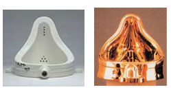 その四〜あなたはどうして『仏陀』なの〜@横浜美術館 * * (…いらっしゃらないと思いますが念のため 食事前後中の方はお読みにならないほうがいいと思います) * * 「マルセル・デュシャンと20世紀美術〜芸術が裸になった、その後で」というタイトル通り、デュシャン自身の作品とそれに触発されて制作された後代の芸術家の作品が並べてありました。 デュシャン(1887-1968)の『泉』(写真左、1912)とそれへのオマージュであるシェリー・レヴィーン(1946-)の作品、金色に塗装されたブロンズ製の『"泉"(デュシャンによる)』(写真右、1991)なんですが。
