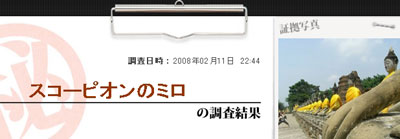 以下にツボッたところを抜粋します。 太字が調査結果で細字が油の寸感です。 酩酊したアリエスのムウは「牡牛座…、鬼…」とつぶやいていた。 ア・・・アルデバラン・・・!善人を絵に描いて拡大したかのような彼に何があったのだ!? と、激しく動揺。まさかあの善の顔は表の顔で実は・・・鬼のように、鬼のような鬼なのか? 金牛宮によると、タウラスのアルデバランは「一言でいってアイオリア」らしい。 その換言ではマッチョということしか合っていないのですがいいのか? 星矢のキャラはそれぞれ濃いからほんと混ぜるな危険です。 酩酊したジェミニのサガは「次期教皇…、出身地…」とつぶやいていた。 関心事がなんだか昔の彼のそれっぽくて笑ってしまいました。 原作の魔鈴さんとシャイナの会話から出自がギリシア人ではない云々って当時の聖域ではいろいろ言われてたらしいことは想像つきますしね。サガにしては意外にまともだ。 酩酊したキャンサーのデスマスクは「者たち…、カニ型…」とつぶやいていた。 わけのわからなさがたまりません。確かに彼の聖衣はまごうことなきカニ型ですが。 デスマスクはかなりデロンデロンになりそうなので支離滅裂なのも妙に納得がいく。 酩酊したアイオリアは「風…、獅子座…」とつぶやいていた。 詩人だ(笑) アイオリアといえば魔鈴。 ストレートに嬉しがってました私の中のアイオリアが(笑) サプリメントの歴史にはアイオリアの影が見え隠れしている。 見えるのはいいですが、隠れるのは彼には似合いません。男らしくないぞ。 酩酊したバルゴのシャカは「神…、ムウ…」とつぶやいていた。 これ、ある種のお告げだと思いました。直感的に。 今シャカムウ活字断ちしているんでいろんな意味でキました。 ライブラの童虎はシオンなしでは生きていけない。 彼らにカプじゃなくてもちょっと深いつながりを感じました。 お互い本当に死にそうもないですけどね。 サジタリアスのアイオロスは、聖闘士星矢ガシャポンセットについて何かを掴んでいるいるらしい。 永遠の14歳アイオロス・・・あれ、対象年齢15歳以上とかじゃなかったかな・・・(ウロ) スコーピオンのミロについて聞くと、瞬は堅く口を閉ざした。 何を知っている瞬(笑) カプリコーンのシュラは半殺しなしでは生きていけない。 ひどくてよい。 酩酊したアクエリアスのカミュは「上腕アーマー…、東シベリア…」とつぶやいていた。 「膝下ウォーマー」なら納得いくんですけどね。やはり心はいつもシベリアなのか・・・。 クールについて調べると、必ずアクエリアスのカミュに行き当たる。 「必ず」、というのがいい。誰が一体クールについて調べるかも気になる。 ピスケスのアフロディーテといえばバラ。 ここらへんはまともなのに ピスケスのアフロディーテは聖衣をダシに宮を口説いていた。 こういうのが出るのは仕方ないですよね。 酩酊したアリエスのシオンは「師匠…、羊…」とつぶやいていた。 羊とつぶやくシオンが可愛すぎてドキドキしましたどうしよう。 シオンも師匠コンプレックスがあったら萌える・・・。ああ、自分の放置テキスト思い出す;師匠が羊だったとしてもいい。 ムウ様によると、アッペンデックスの貴鬼は「一言でいって登場人物」らしい。 アッペンデックスの貴鬼は、アッペンデックスについて聞いて回っていた。 ・・・涙なしには読めません。 アッペンデックスの貴鬼は、念動力について何かを掴んでいるいるらしい。 頑張れ、貴鬼!! ・・・以上です。 依頼元はこちらです→(http:)//detective.kayac.com/ ちなみに友人から「エクトプラズムの歴史には(油の中の人)の影が見え隠れしている。」 とのオカルトな報告のおかげでここにたどり着きました。 泥酔してる彼らを想像するのは楽しかったです。 キャンサーのデスマスクの証拠写真なる画像が群を抜いて充実していたこと アイオリアの素行調査(聞き込み)にえらく時間がかかって 結局「レオの〜」では出てこなかったことも書いておきます。 証拠写真、適当に貼られるやつですが、アイオロスの証拠写真がトラの巨猫で アフロディーテの写真がペンギンだったりとか シュラの写真にモザイクがかかっていたりとか、 地味におかしかったです。 ちなみにバルゴのシャカの写真はカボチャでした。立派でした。 08.02.11.娑婆へ 探偵といえば油の中の人は素行が悪いので「探偵をつける」としょっちゅう言われます。 脅かしとかではなくうちの親はいつだって本気です。 |