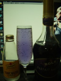 その二 完全なる愛(パフェタムール) 先日Parfait Amourなるリキュールを購入しました。 オランダはBOLS社製。 その色が恐いくらいの紫なのです。 完全なる愛という名称に惹かれ… …いや、正直に書きましょう。 これを割ったら薄紫の液体になるのかな〜と 思ったときにはすでに買ってました(病末期)。 3:1の割合でトニックウォーターで割ると パープルラブなるカクテルになるらしいのですが 実際甘くて飲めたものではないです。 20:1くらいで十分なくらいの超激甘。 カキ氷のシロップ系というか錠剤の糖衣というか。 いかにも人口甘味料な激烈な甘さ。 ラベルの裏をみると赤2、青1。 と、実に分かりやすく合成着色料が添加されてました…。 (思わず発ガン性をチェック…) 味はともかく色合いは実に見事な紫なので いっそ水で薄めてインテリアにしようかと思ってます…。
